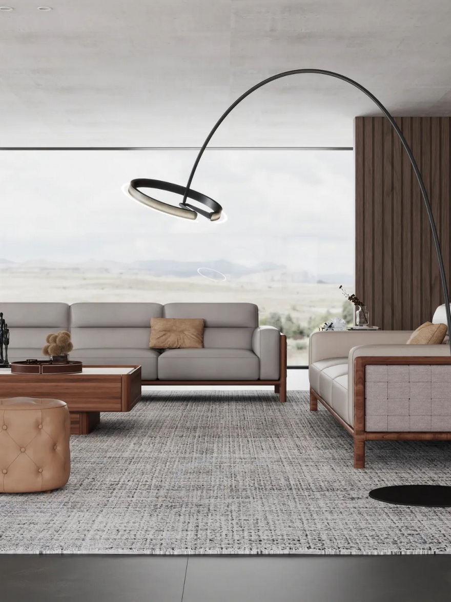 一旁弧形落地灯以金属线条划出优雅弧度,灯光如月光倾泻,为角落营造出独处或阅读的静谧感。墙面的木质护板与水泥质感背景墙碰撞,自然肌理与工业质感交织,让空间既有温度,又不失现代设计的利落。