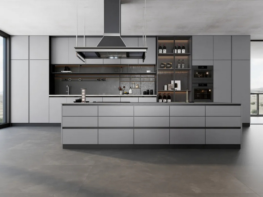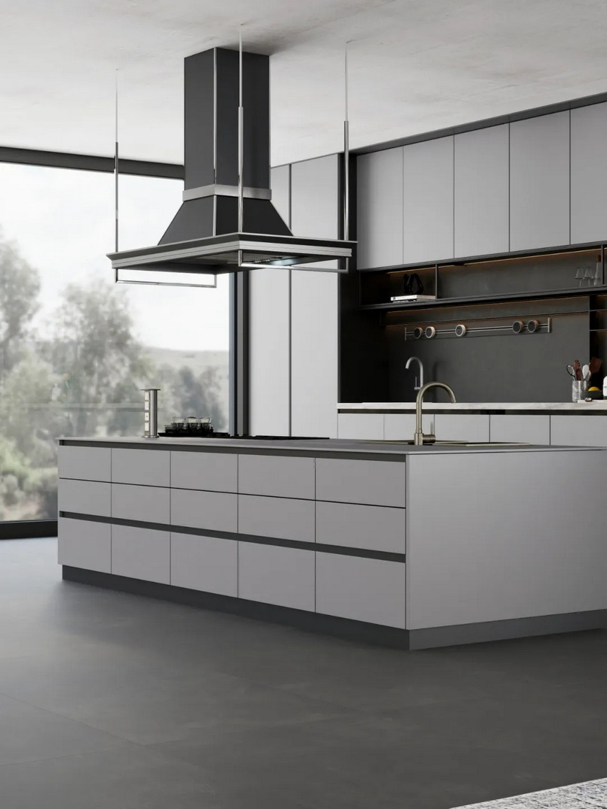 浅灰色橱柜门板线条简洁,与深色中岛台面形成冷暖对比;