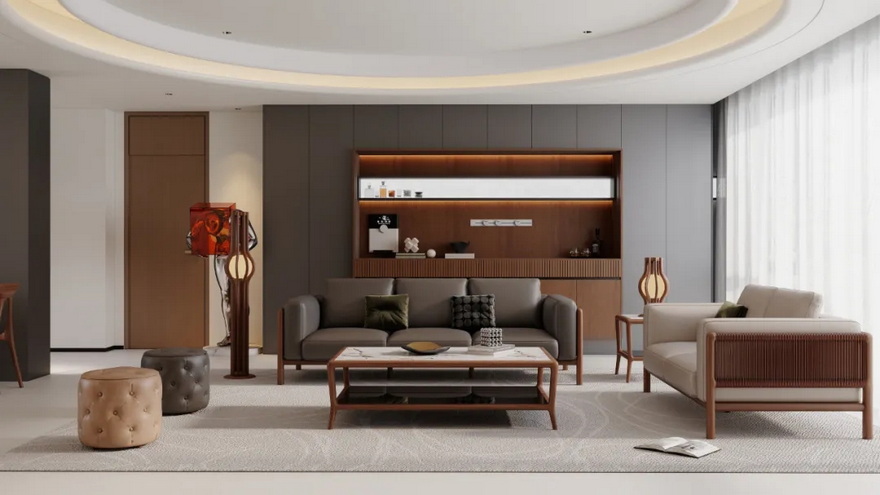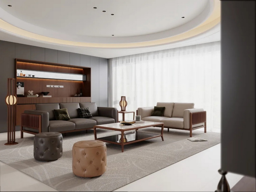 客厅以 “低饱和度色系 + 天然材质”,营造出能让人彻底放松的场域。浅棕与深灰的皮革沙发,用木质框架勾勒出复古与现代交融的线条,软乎乎的皮革质感仿佛在 “邀请” 人陷进去放空;大理石纹理的茶几、带着编织元素的边几,不同材质的碰撞让空间层次愈发鲜活。