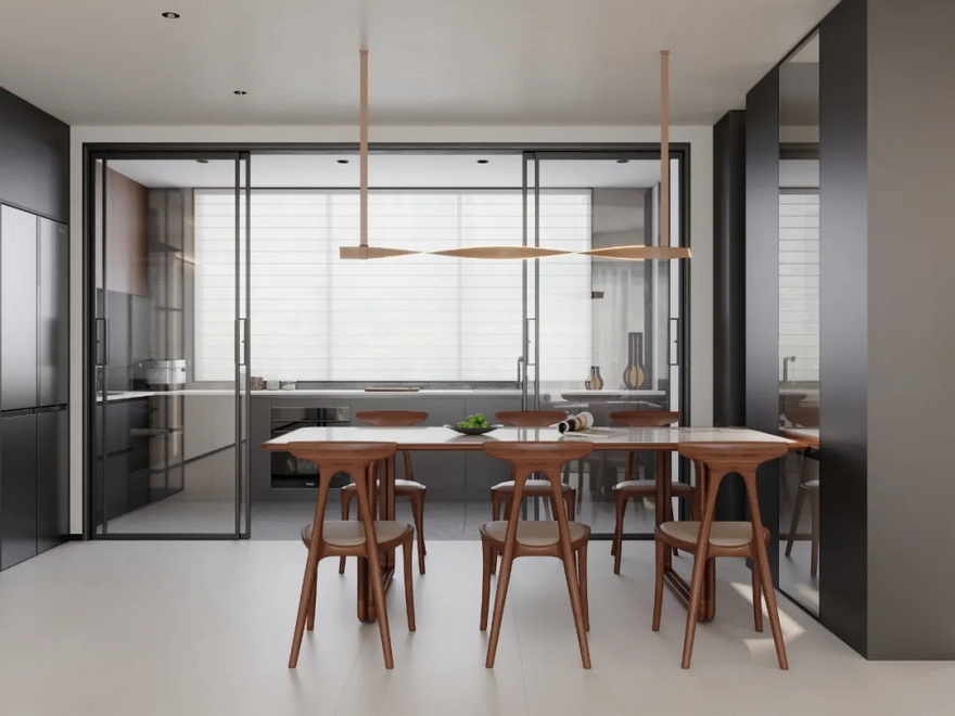 餐厅区域,大理石岩板纹理的餐桌如一块天然艺术画布,木质桌腿的弧线设计柔化了石材的冷硬;