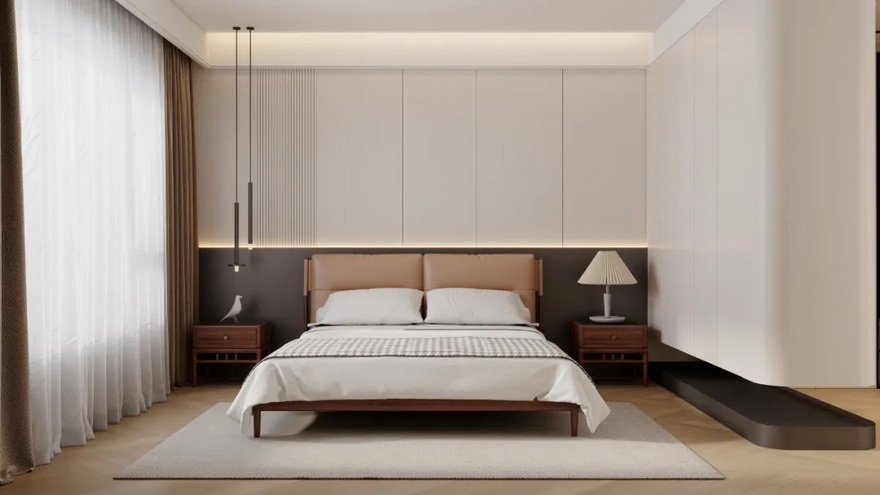 两侧的木质床头柜小巧精致,一盏简约台灯的暖光,让睡前阅读成为治愈的仪式;大尺寸衣柜采用 “一门到顶” 设计,不仅最大化利用垂直空间收纳衣物,更以整洁的立面保持了卧室的清爽感,悄悄藏起生活的琐碎。