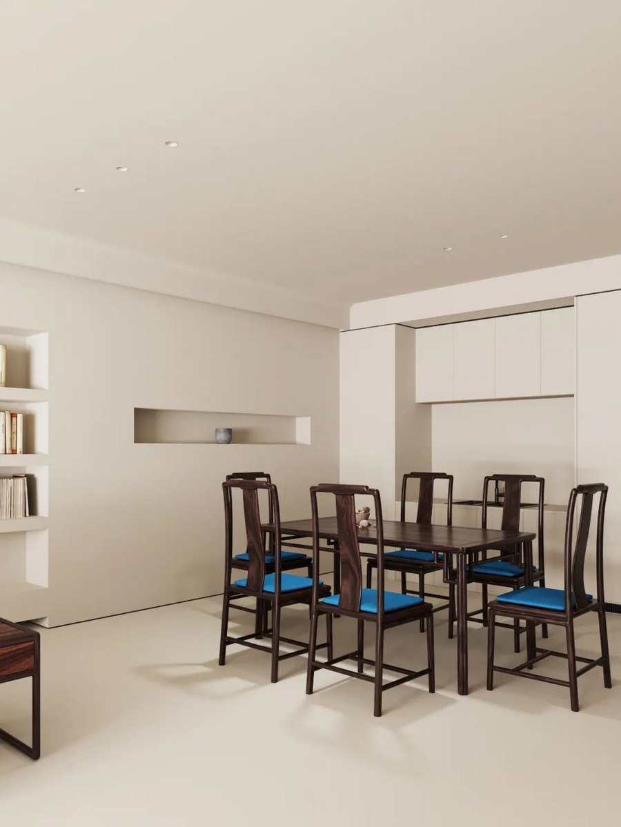 餐厅与客厅通过开放的布局相互呼应,光影的变幻与餐桌椅之间建立了微妙的联系,营造出一个岁月流转、初心如磐的东方诗意场景。