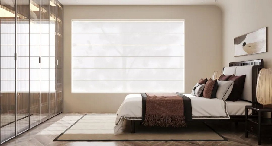 重整过比例的全景窗宛如一幅取景框,透过窗帘将室外的树影引入室内,增添了一份生动的叙事感。