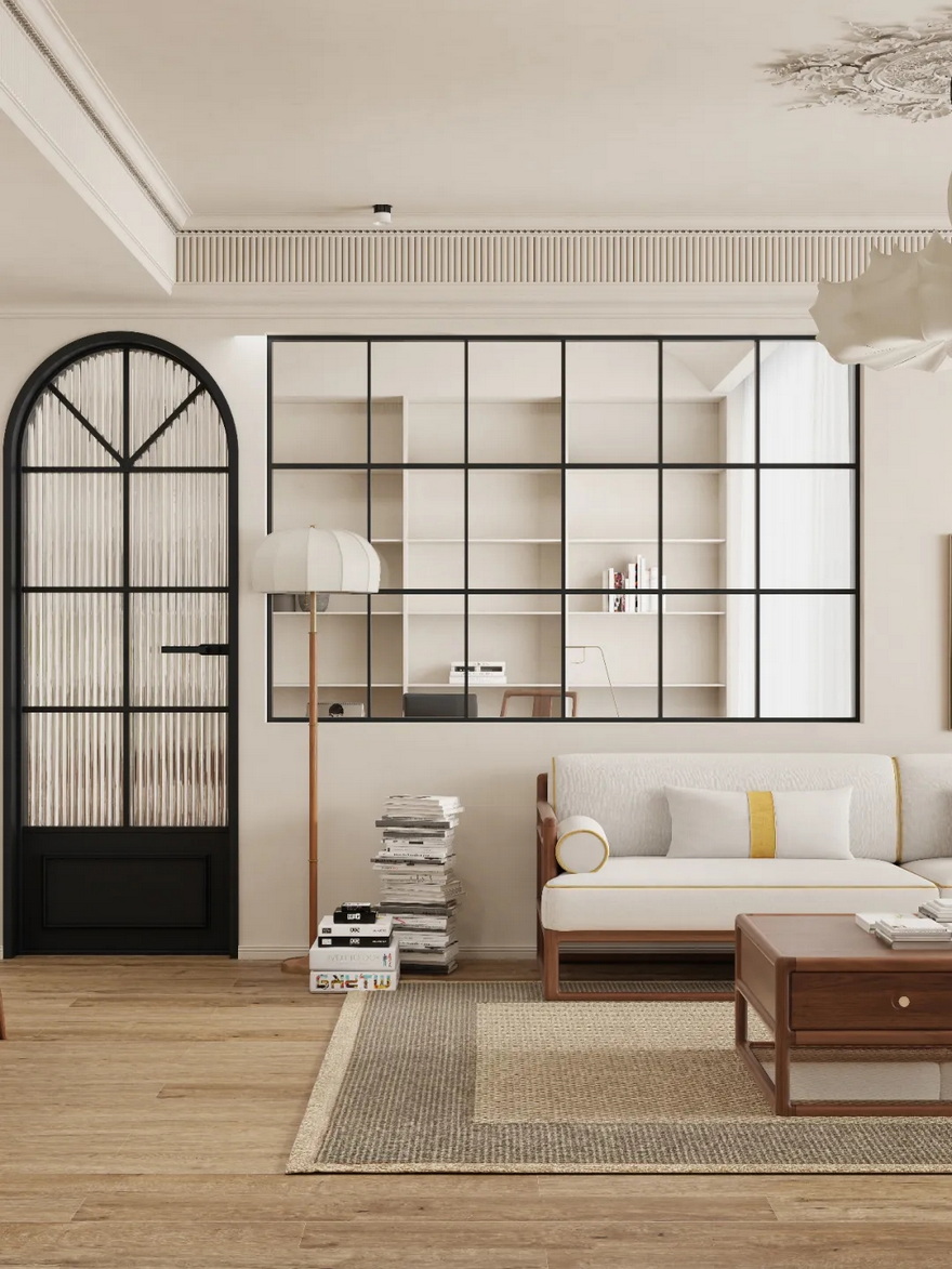 客厅的设计巧妙地将空间层次感和流动性发挥到了极致。左侧的半圆形黑色门如同通往另一个世界的神秘入口,而门上方的白色吊灯则如同夜空中的明星,为整个空间增添了一抹温暖的色彩。这种设计不仅展示了中式建筑的严谨与庄重,也融入了美式设计的自由与奔放,两种风格在这里相得益彰,呈现出一种别样的和谐之美。