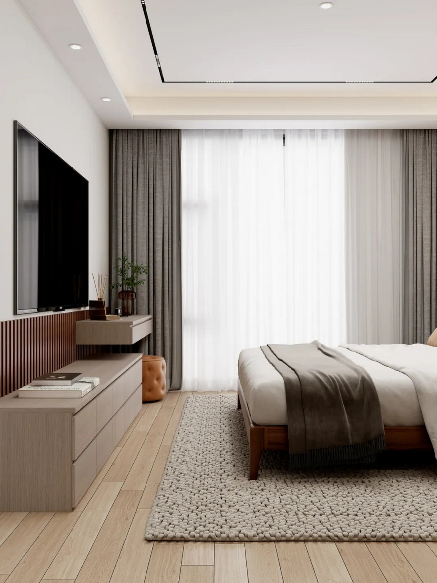 主卧,是放松身心、恢复精力的私密领地。在这里,设计摒弃了繁琐的装饰元素,转而追求极致的舒适与宁静。棕色原木质的家具与白色床品相得益彰,营造出一种简约而不失温馨的氛围。