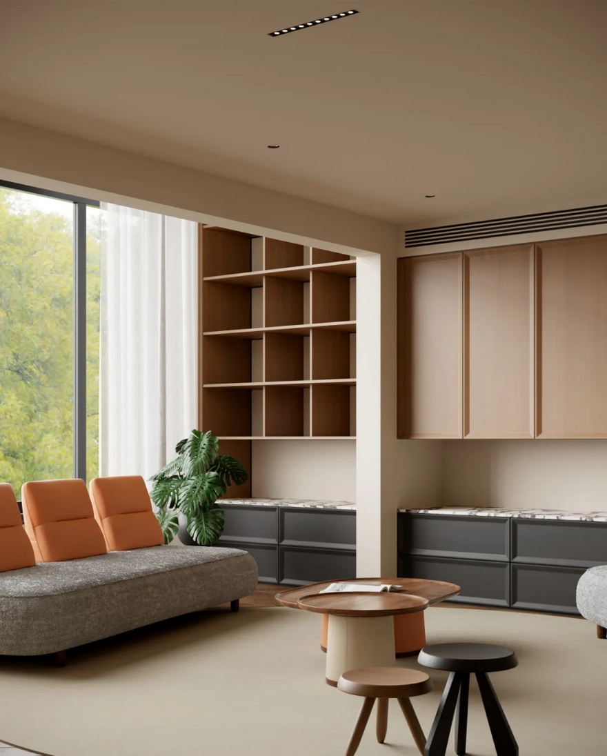 灰色布艺与橙色皮质拼接的模块化沙发,是空间的 “互动中枢”—— 亲友围坐时它是温暖的聚合体,独处休憩时又能拆分出私密的角落。