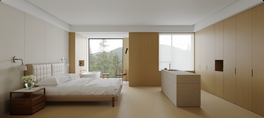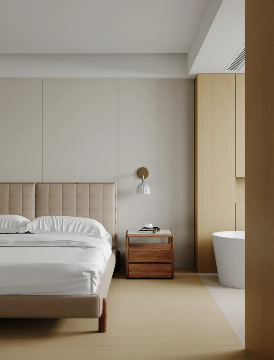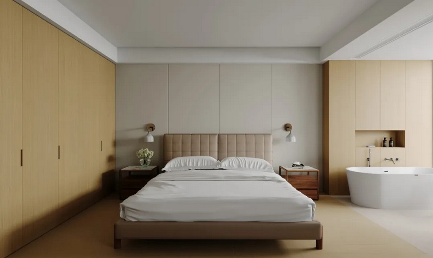 卧室布局:保持卧室的宽敞与通透,通过合理的家具摆放,创造出一个舒适且实用的休息空间。大床作为卧室的核心,应摆放在房间的最佳采光和视野位置,确保主人能够享受舒适的睡眠环境。