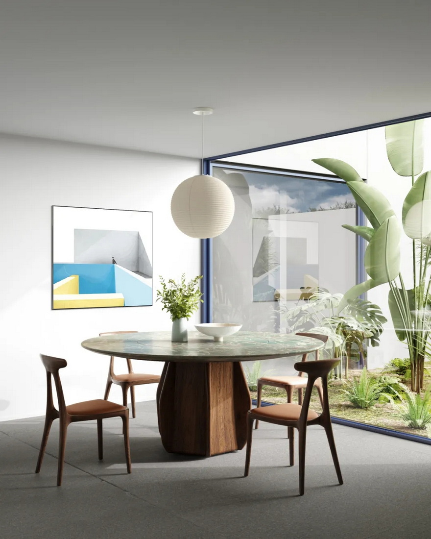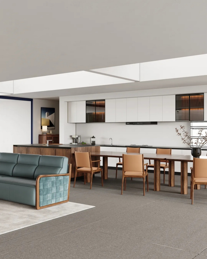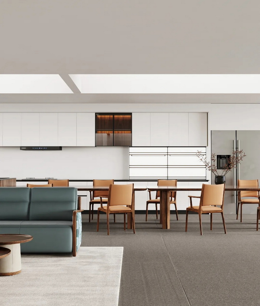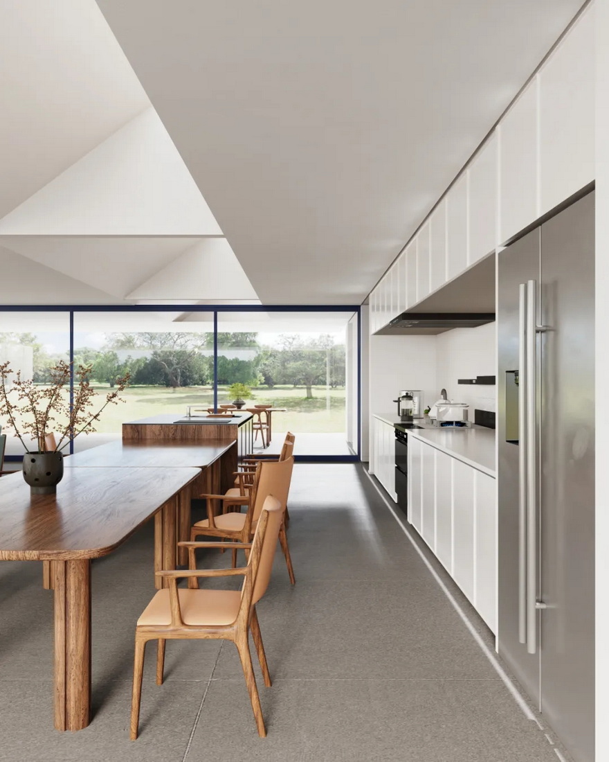 把厨房外移到花园旁,让客餐厨形成 “洄游动线”—— 做饭时能照看客厅玩耍的孩子,用餐时可直接望向窗外绿意,把 “孤岛式厨房” 变成家庭社交中心。