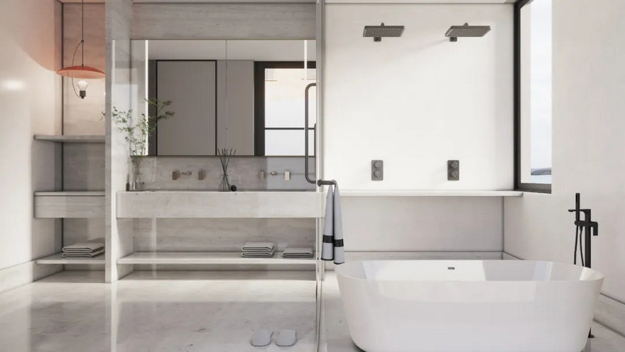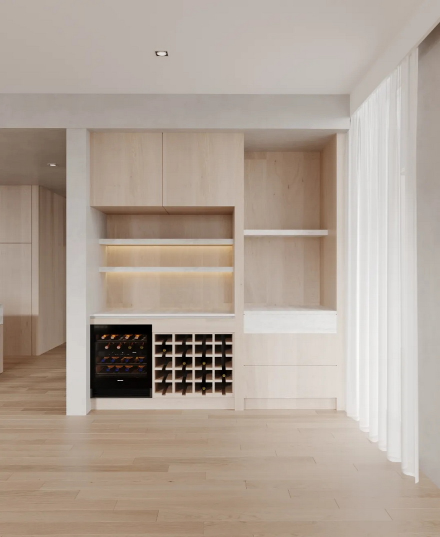 抛光石膏天花板、石灰华台面、定制木作、凹槽玻璃门……