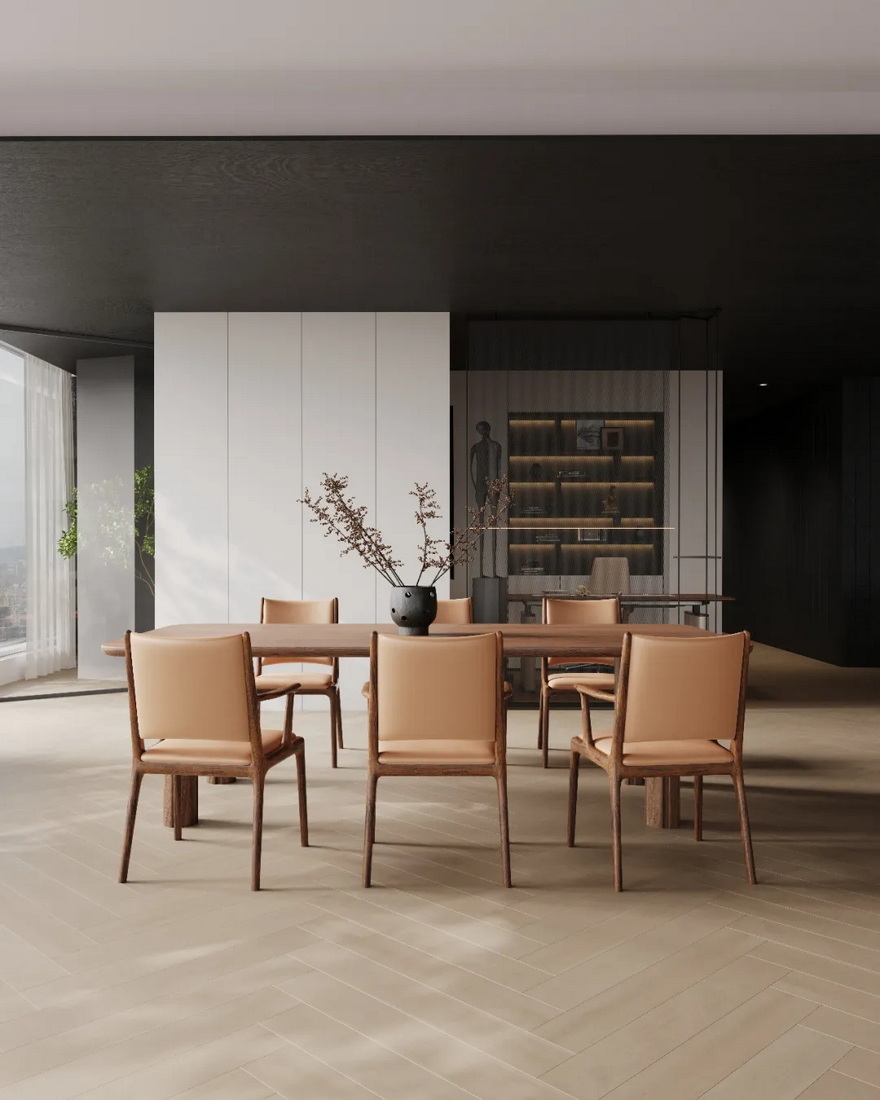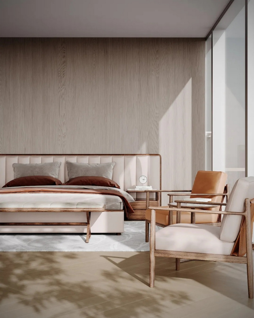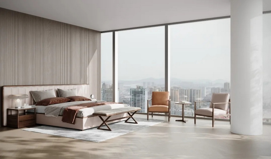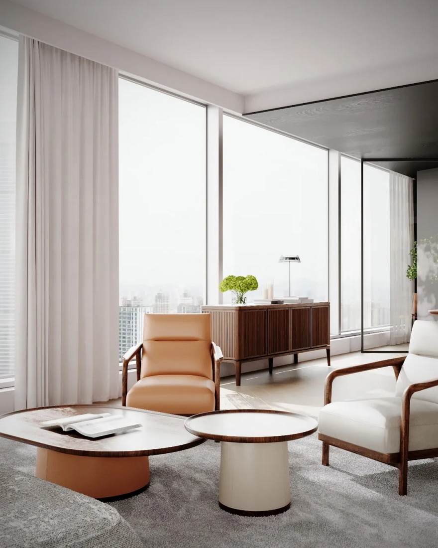 线条恪守“少即是多”,摒弃繁杂装饰,以极简线条勾勒轮廓,克制中藏足张力。家具多为几何形态与弧线结合,座椅弧线贴合脊背、椅腿直线收尾,柜体门片借胡桃木竖向纹理点缀,通透整齐。