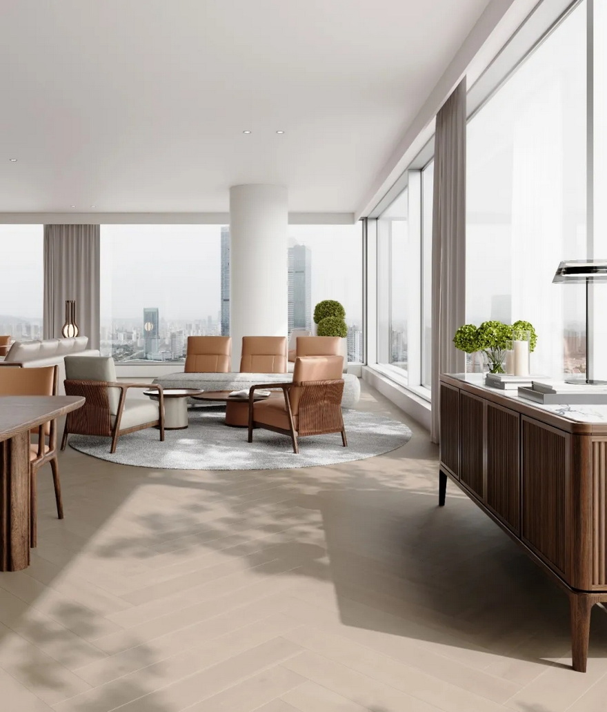 整体基调循着“自然共生”铺展,从天然材质肌理中汲取灵感,以低饱和色调构建统一语境。既保都市利落感,又借原生材质温润中和水泥冷硬,让美学与功能在此各得其所、互不妥协。