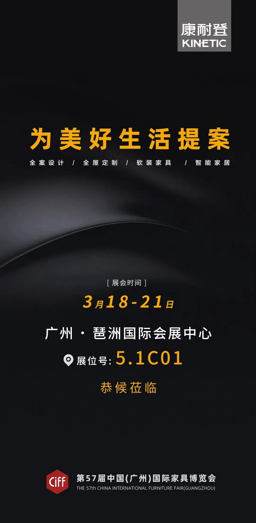 为美好生活提案,为共赢筑新程。2026年3月18日至21日,广州琶洲,康耐登携高颜高性价比全案新品与多重扶持政策,诚邀各位家居创业者、行业伙伴莅临展台,共探盈利之道,抢占市场风口,携手开启事业与美好生活新征程!