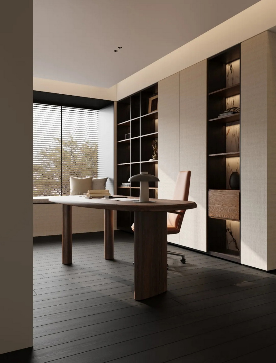 书房为工作、阅读、临时休憩、轻收纳的复合功能区,兼顾实用性与静谧感,书桌优先靠窗布置,最大化利用自然采光,让阅读与工作时更具舒适感;灯光设计以均匀柔和为主,避免眩光产生,为长时间专注工作、静心阅读提供适宜的光环境,整体营造出安静、理性、有序的空间气质,成为家庭的“精神充电站”。