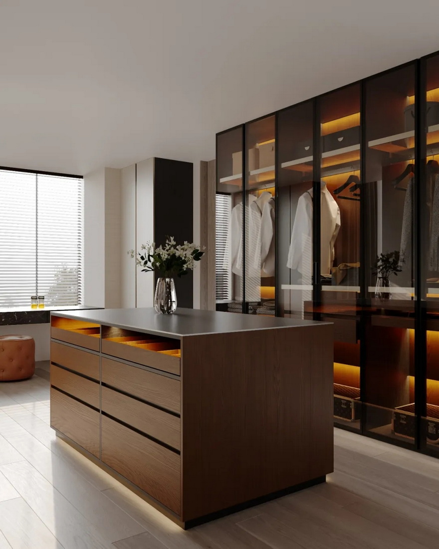 衣帽间作为居住品质的隐形体现,设计严格遵循分类收纳、一目了然、便捷取用的原则,功能分区清晰合理,涵盖长衣区、短衣区、裤架区、叠放区、内衣抽屉区,同时设置中岛台,专门用于收纳首饰、手表、包袋等精致物品,满足不同品类物品的收纳需求。