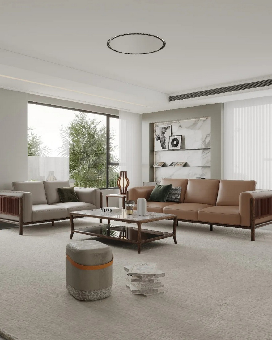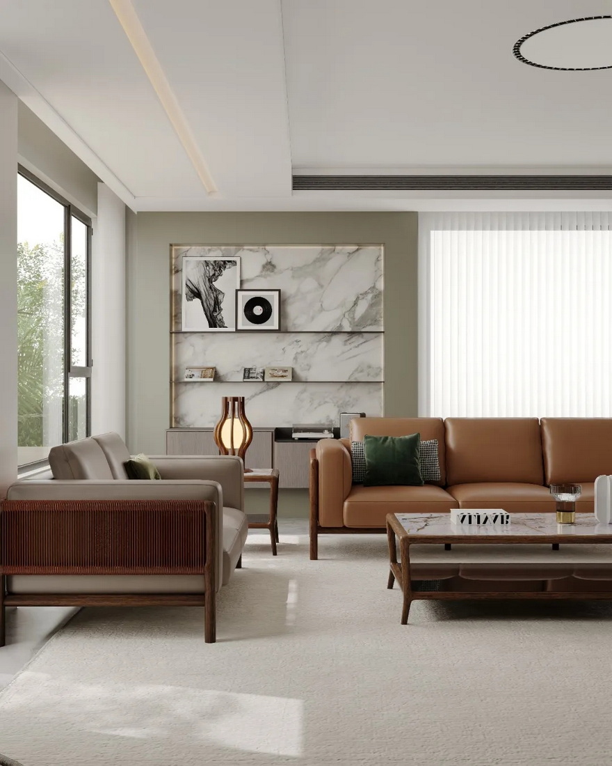 核心材质的北美黑胡桃木,保留木材天然的纹理与醇厚色泽,细腻皮革,让材质本身成为空间最好的装饰;米白、浅灰与原木色铺就基底,空中花园的鲜绿与软装的暖黄零星点缀,既贴合老人温和的视觉习惯,也为空间添了几分生机。