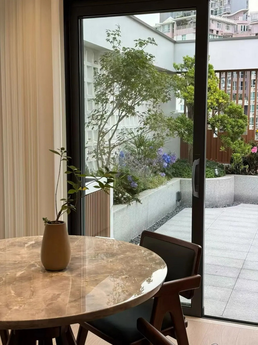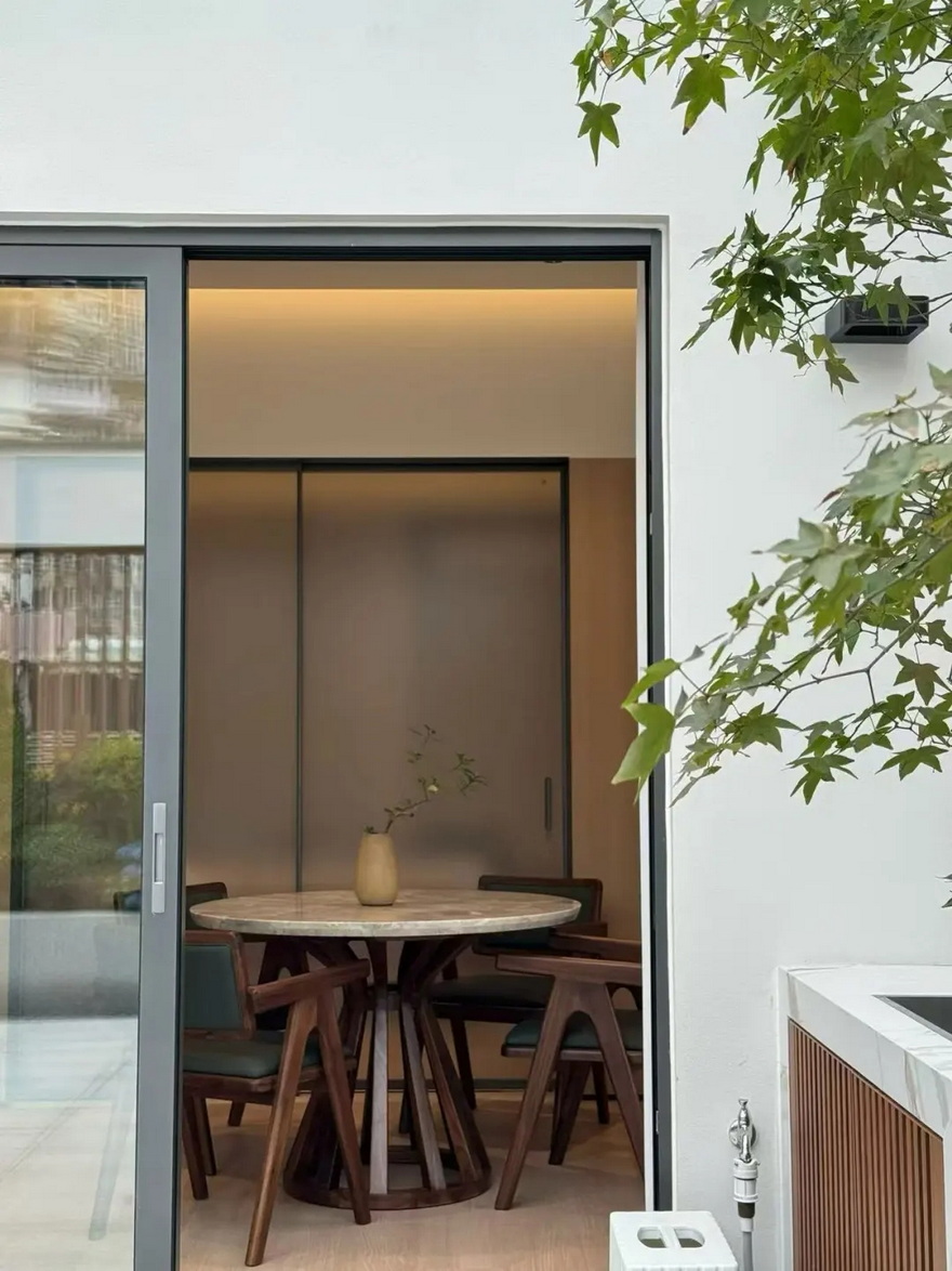午后阳光透过棚架洒在木质家具上,光影斑驳间,老人坐着歇脚、看花,格外惬意。角落做了嵌入式无拉手收纳柜,把园艺工具都藏在里面,既整齐又不破坏花园的自然感。