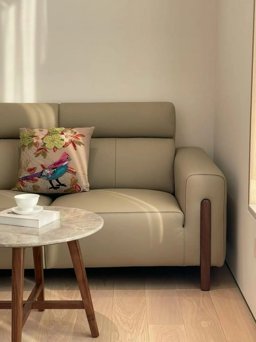 客厅和餐厅打通后空间更通透,顺着“让空间自由流动”的设计理念来规划。客厅放了实木功能沙发,桉木框架搭配米白色透气面料,里面填的是竹炭海绵,既环保又够支撑,软硬度刚好适合老人久坐;搭配的胡桃木茶几做了圆角处理,不用担心磕碰。电视墙没做复杂造型,只用胡桃木饰面板和肌理漆简单拼接,还留了隐形收纳位,看着干净清爽,也合老人喜静的性子。