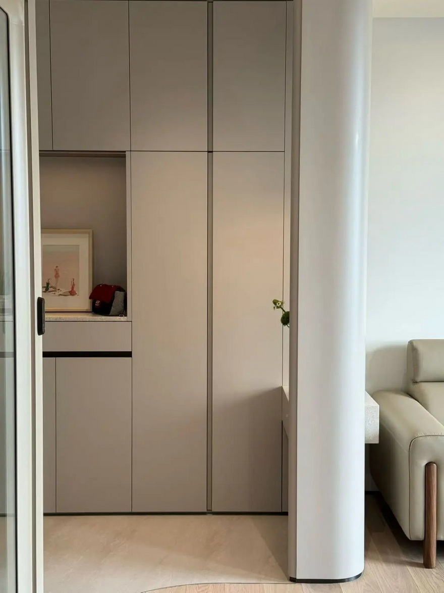 入户玄关定制了一套康耐登同款实木收纳系统,特意设计成“下悬+中部开放+上部封闭”的样式。下方悬空处刚好能放拖鞋和轮椅,老人进门不用弯腰搬挪;