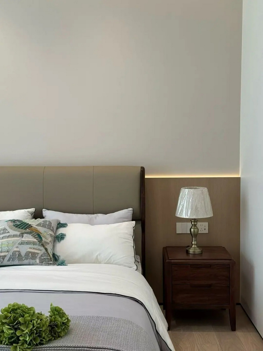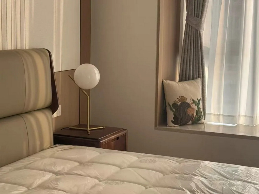 主卧围绕“安静、安全”来打造,呼应康耐登寝具系列的设计初心。米白色环保肌理漆墙面配浅灰色实木复合地板,氛围温和不刺眼;