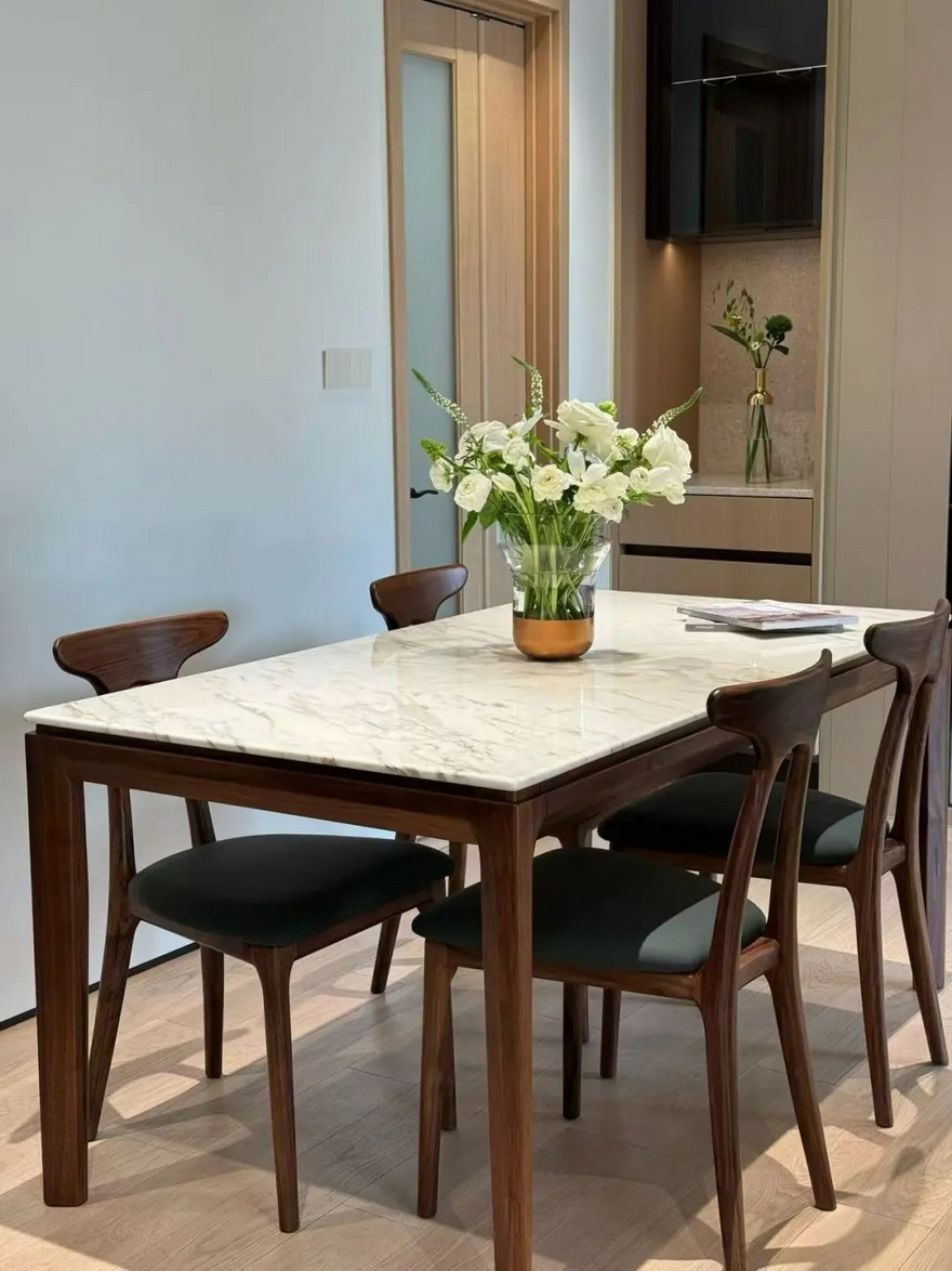餐厅搭配康耐登经典款实木餐桌,岩板桌面配胡桃木材质,样子简单却很有质感,一家人围坐吃饭刚刚好。配套的实木餐椅带扶手,座面软包填了大豆海绵,扶手高度经过仔细测算,老人起身时能借上力,暖光落在饭菜上,寻常三餐也有了几分仪式感。