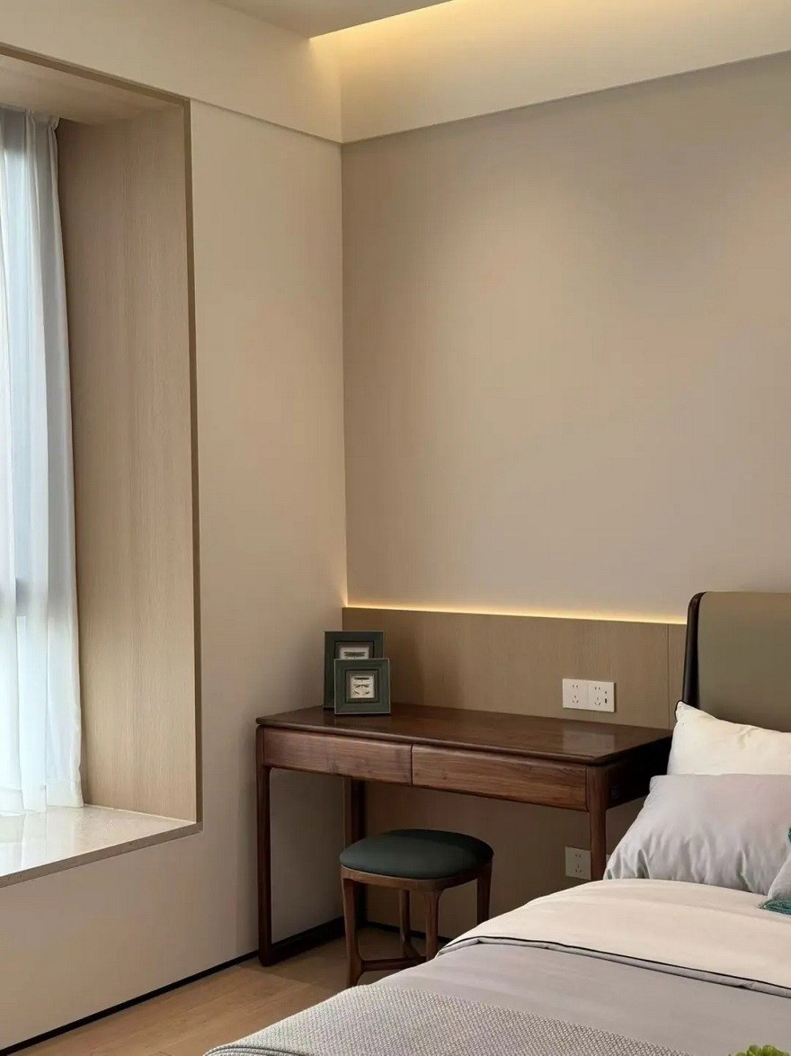 客房兼顾了书房和睡眠功能,放了康耐登实木书桌和扶手椅,书桌线条简洁,腿部空间充足,老人坐着看书不憋屈;扶手椅的软包和主卧风格一致,久坐也舒服。