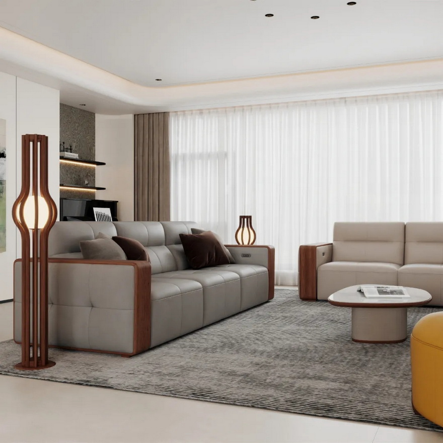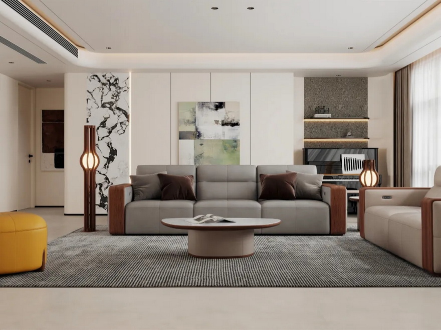 浅灰色皮质沙发搭配木色扶手,棕色抱枕增添温暖;圆形茶几、黄色单人椅打破规整,营造松弛感。家具的 “模块化组合”,让空间可根据需求灵活调整(如接待访客时拉开距离,亲子时光时围合互动)。