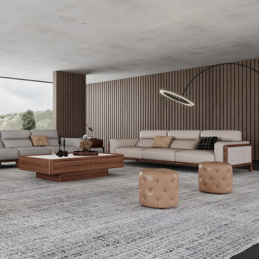 紧邻的客厅,以浅灰沙发、木质茶几与皮革墩子营造出松弛感:浅灰沙发的柔和质感,与木质茶几的硬朗线条形成对比,却因木色的统一而和谐相融;地面编织纹理的地毯如 “柔软画布”,承载家具的同时更添层次;