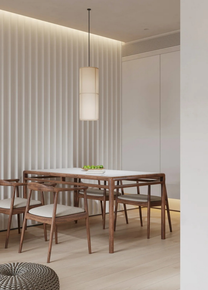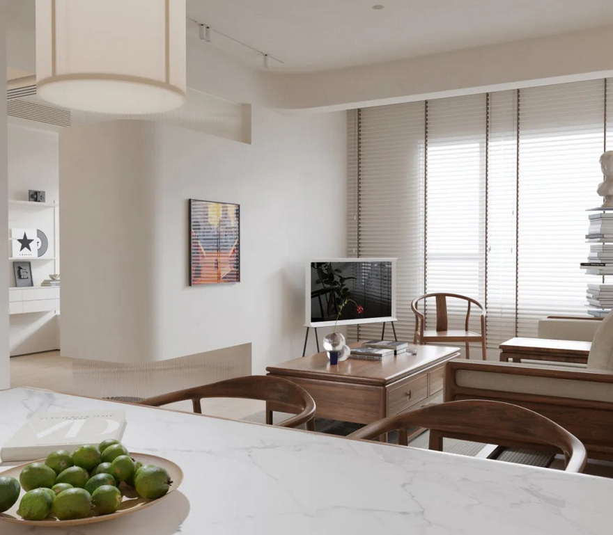 餐厅与客厅相连,胡桃木质地的餐桌椅散发着素简有味的气韵,将就餐氛围烘托出了悠然的韵律与精致的仪式感。