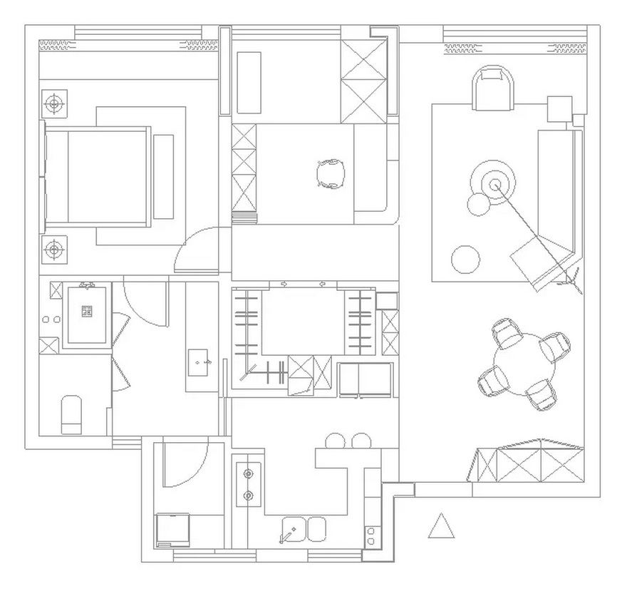 硬装造型上弱化轮廓,阳台棱角处做成弧度造型,柔化空间轮廓。软装上选择圆润款的家具造型,融入藤编、布艺等元素,空间的整体效果更柔和。